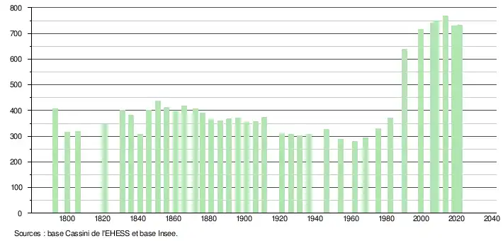 - Population municipale légale en vigueur au 1er janvier 2024, millésimée 2021, définie dans les limites territoriales en vigueur au 1er janvier 2023, date de référence statistique : 1er janvier 2021.