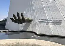Du Grand Volcan sort à sa base une sculpture-fontaine, qui est un moulage de la main d'Oscar Niemeyer[3]. Sa citation révèle son engagement politique : « Un jour, comme cette eau, la terre, les plages et les montagnes, à tous appartiendront ».