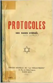 Les Protocoles des Sages de Sion, en russe : Протоколы сионских мудрецов ou Сионские протоколы, est un texte inventé de toutes pièces par la police secrète du tsar et publié pour la première fois en Russie en 1903[1],[2]. Ce faux se présente comme un plan de conquête du monde établi par les Juifs et les francs-maçons[3]. Traduit en plusieurs langues et diffusé à l'échelle internationale dès sa parution, il devient un best-seller.