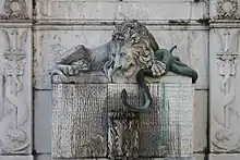 Tout en haut, fut rajoutée en 1957 une inscription à l'occasion du bimillénaire de Grenoble, rappelant le premier pont jeté en ce lieu le 6 juin 43 av. J.-C.[6]. Cette inscription constitue, au sens propre, une erreur monumentale, car 1999 années seulement séparent juin 1957 et juin 43 av. J.-C. Il semble que l’on ait oublié de tenir compte de ce que, pour les historiens, il n’y a pas d’an 0, l’an 1 suivant immédiatement l’an 1 av. J.-C.