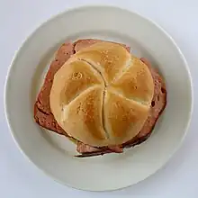 - en tranche, chaud, placé dans un petit pain — appelé en Bavière —, assaisonné de moutarde. Le résultat, généralement appelé (ou Leberkäsweggla en Franconie), se rencontre souvent dans les fast-food bavarois et autrichiens ;