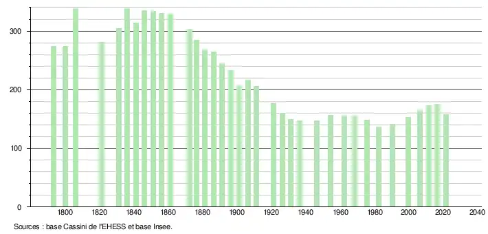 L'évolution du nombre d'habitants est connue à travers les recensements de la population effectués dans la commune depuis 1793. Pour les communes de moins de 10 000 habitants, une enquête de recensement portant sur toute la population est réalisée tous les cinq ans, les populations légales des années intermédiaires étant quant à elles estimées par interpolation ou extrapolation[16]. Pour la commune, le premier recensement exhaustif entrant dans le cadre du nouveau dispositif a été réalisé en 2006[17].