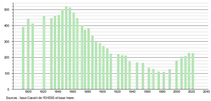 L'évolution du nombre d'habitants est connue à travers les recensements de la population effectués dans la commune depuis 1793. Pour les communes de moins de 10 000 habitants, une enquête de recensement portant sur toute la population est réalisée tous les cinq ans, les populations légales des années intermédiaires étant quant à elles estimées par interpolation ou extrapolation[14]. Pour la commune, le premier recensement exhaustif entrant dans le cadre du nouveau dispositif a été réalisé en 2006[15].