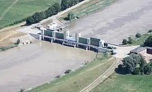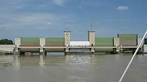 Il n'y a pas d'écluses sur la Leda, mais seulement un barrage mobile avec un pertuis pour le passage des navires. Ce barrage a été construit entre 1950 et 1954 comme ouvrage de protection contre les crues, et est entré en service en . Il comporte 5 vannes levantes de 14 m de largeur par 10,50 m de hauteur. Le pertuis de navigation occupe la partie centrale. Dès le mois de , ce barrage permit de réguler le niveau des eaux en amont en prévenant les effets d'une marée exceptionnelle.
