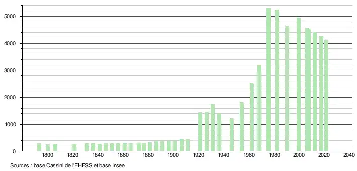 - Population municipale légale en vigueur au 1er janvier 2024, millésimée 2021, définie dans les limites territoriales en vigueur au 1er janvier 2023, date de référence statistique : 1er janvier 2021.