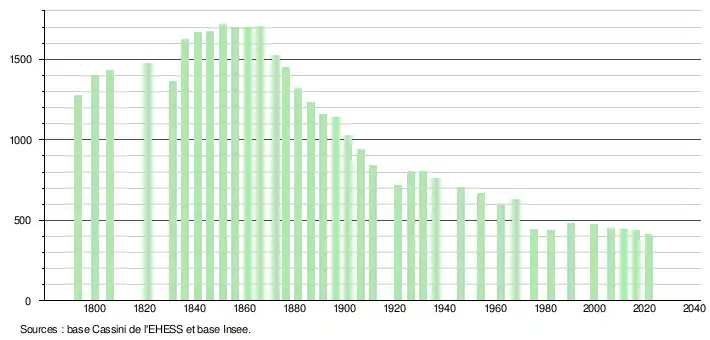 L'évolution du nombre d'habitants est connue à travers les recensements de la population effectués dans la commune depuis 1793. Pour les communes de moins de 10 000 habitants, une enquête de recensement portant sur toute la population est réalisée tous les cinq ans, les populations légales des années intermédiaires étant quant à elles estimées par interpolation ou extrapolation[27]. Pour la commune, le premier recensement exhaustif entrant dans le cadre du nouveau dispositif a été réalisé en 2006[28].