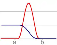 On cherche alors à construire la fonction illustrée en bleu sur la figure de gauche. C'est une fonction ψab de R dans l'intervalle [0, 1] qui vaut 1 pour toute valeur inférieure à a, 0 pour toute valeur supérieure à b et qui est infiniment dérivable. Pour la construire, il suffit de considérer la primitive de la fonction -k.φab qui vaut 0 en b. La fonction fδ est alors définie par :