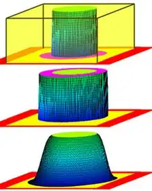 On suppose que E est un espace euclidien, K, illustré en vert sur la figure de gauche est un compact, Ω est un ouvert contenant K, en jaune sur la figure et on note cΩ, en rouge, le fermé complémentaire de Ω. L'objectif est de construire une application définie sur E, à valeurs dans [0, 1], qui vaut 1 sur K, 0 sur cΩ et infiniment différentiable. Cela revient à dire que la fonction g recherchée possède un graphe inclus dans la cage jaune de la figure en haut à droite (sauf sur la zone rouge où elle est nulle) et qu'elle recouvre le graphe de la fonction caractéristique que K, illustrée en bleu-vert sur la même figure. En termes plus mathématiques on obtient, si χK et χΩ désignent les fonctions caractéristiques de K et de Ω :