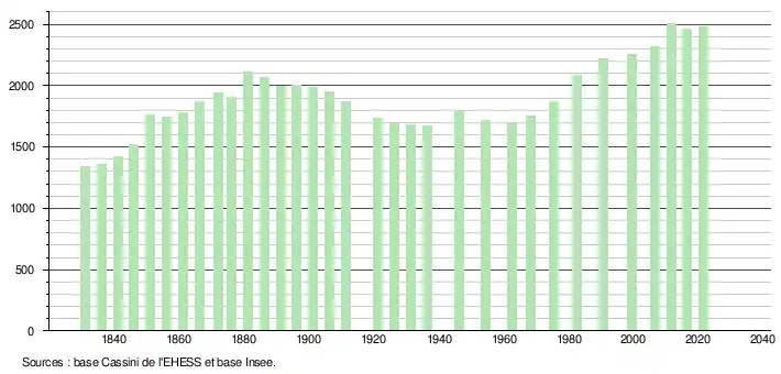 L'évolution du nombre d'habitants est connue à travers les recensements de la population effectués dans la commune depuis 1831. Pour les communes de moins de 10 000 habitants, une enquête de recensement portant sur toute la population est réalisée tous les cinq ans, les populations légales des années intermédiaires étant quant à elles estimées par interpolation ou extrapolation[33]. Pour la commune, le premier recensement exhaustif entrant dans le cadre du nouveau dispositif a été réalisé en 2006[34].