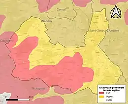 Les mouvements de terrains susceptibles de se produire sur la commune sont des tassements différentiels[20]. Le retrait-gonflement des sols argileux est susceptible d'engendrer des dommages importants aux bâtiments en cas d’alternance de périodes de sécheresse et de pluie[21]. La totalité de la commune est en aléa moyen ou fort (79,5 % au niveau départemental et 48,5 % au niveau national)[Carte 2]. Depuis le , en application de la loi ÉLAN, différentes contraintes s'imposent aux vendeurs, maîtres d'ouvrages ou constructeurs de biens situés dans une zone classée en aléa moyen ou fort[Note 3],[22].