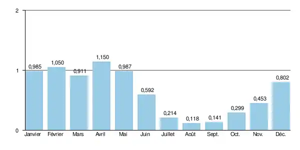 Les crues peuvent être très importantes, compte tenu de l'exiguïté du bassin versant. Les QIX 2 et QIX 5 valent respectivement 28 et 41 m3/s. Le QIX 10 est de 49 m3/s, le QIX 20 de 57 m3/s, tandis que le QIX 50 se monte à 67 m3/s.