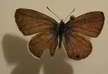 Leptotes marina est un petit papillon d'une envergure de 22 mm à 29 mm de couleur violine tirant sur le bleu ardoisé chez le mâle, tirant sur le marron chez la femelle, avec deux taches noires proches de l'angle anal de l'aile postérieure.