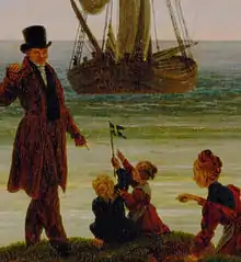 Sur la plage, le personnage le plus près du spectateur est un vieil homme se tenant de dos, face à la mer. Devant lui se tient un jeune homme portant un chapeau haut-de-forme. Plus loin encore, une jeune fille allongée à terre joue avec deux enfants. Les deux enfants jouent avec un drapeau suédois à côté d'elle.