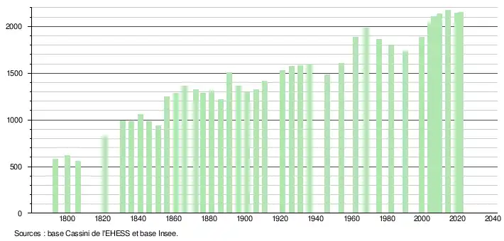 L'évolution du nombre d'habitants est connue à travers les recensements de la population effectués dans la commune depuis 1793. Pour les communes de moins de 10 000 habitants, une enquête de recensement portant sur toute la population est réalisée tous les cinq ans, les populations légales des années intermédiaires étant quant à elles estimées par interpolation ou extrapolation[27]. Pour la commune, le premier recensement exhaustif entrant dans le cadre du nouveau dispositif a été réalisé en 2004[28].
