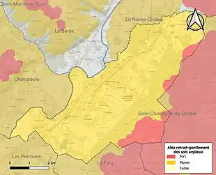 Le retrait-gonflement des sols argileux est susceptible d'engendrer des dommages importants aux bâtiments en cas d’alternance de périodes de sécheresse et de pluie. 99,7 % de la superficie communale est en aléa moyen ou fort (67,4 % au niveau départemental et 48,5 % au niveau national). Sur les 934 bâtiments dénombrés sur la commune en 2019, 934 sont en aléa moyen ou fort, soit 100 %, à comparer aux 84 % au niveau départemental et 54 % au niveau national. Une cartographie de l'exposition du territoire national au retrait gonflement des sols argileux est disponible sur le site du BRGM[24],[Carte 2].