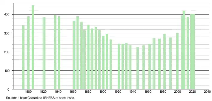 L'évolution du nombre d'habitants est connue à travers les recensements de la population effectués dans la commune depuis 1793. Pour les communes de moins de 10 000 habitants, une enquête de recensement portant sur toute la population est réalisée tous les cinq ans, les populations légales des années intermédiaires étant quant à elles estimées par interpolation ou extrapolation[20]. Pour la commune, le premier recensement exhaustif entrant dans le cadre du nouveau dispositif a été réalisé en 2008[21].