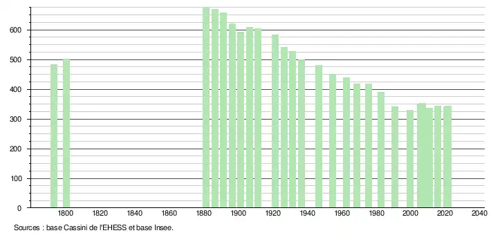 L'évolution du nombre d'habitants est connue à travers les recensements de la population effectués dans la commune depuis 1793. Pour les communes de moins de 10 000 habitants, une enquête de recensement portant sur toute la population est réalisée tous les cinq ans, les populations légales des années intermédiaires étant quant à elles estimées par interpolation ou extrapolation[41]. Pour la commune, le premier recensement exhaustif entrant dans le cadre du nouveau dispositif a été réalisé en 2005[42].