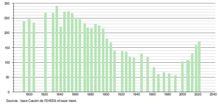 L'évolution du nombre d'habitants est connue à travers les recensements de la population effectués dans la commune depuis 1793. Pour les communes de moins de 10 000 habitants, une enquête de recensement portant sur toute la population est réalisée tous les cinq ans, les populations légales des années intermédiaires étant quant à elles estimées par interpolation ou extrapolation[17]. Pour la commune, le premier recensement exhaustif entrant dans le cadre du nouveau dispositif a été réalisé en 2007[18].