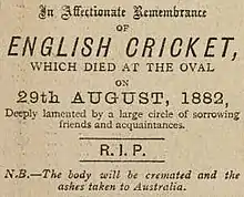 Plusieurs faire-part de décès factices sont publiés dans la presse britannique dans les jours qui suivent[4]. L'un d'eux, écrit pour le Sporting Times, annonce la « mort du cricket anglais » dont les « cendres seront transportées en Australie » : « In affectionate remembrance of English cricket which died at The Oval, 29th August, 1882. Deeply lamented by a large circle of sorrowing friends and acquaintances, RIP. NB The body will be cremated and the ashes taken to Australia. », soit littéralement « En souvenir affectueux du cricket anglais, qui est mort à The Oval le 29 août 1882, profondément pleuré par un large cercle d'amis et de connaissances peinés. Qu'il repose en paix. N.B. : Le corps sera incinéré et les cendres seront transportées en Australie. »[5].