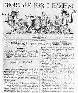 Pinocchio est d'abord paru en feuilleton dans un hebdomadaire pour enfants : Le giornale per i bambini. La conservation des journaux, surtout quand il s'agit de journaux d'enfants, se révélant encore plus aléatoire que celle des livres, des exemplaires originaux d'époque (1881-1883) sont des raretés absolues que l'on ne peut voir pratiquement que dans les bibliothèques.