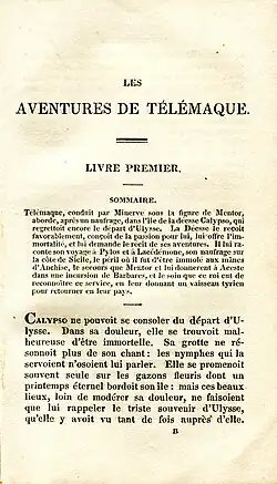 Les Aventures de Télémaque est un roman d'aventures publié en 1699 et composé à l'intention des élèves royaux, en particulier du duc de Bourgogne, le fils du dauphin, dont Fénelon était le précepteur[4]. Ce roman, conjointement épopée et traité de morale et de politique, provoqua à la fois la disgrâce de Fénelon à la cour et sa célébrité immédiate et postérieure.
