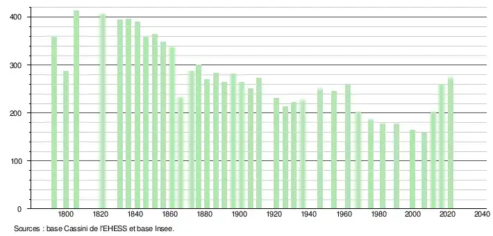 L'évolution du nombre d'habitants est connue à travers les recensements de la population effectués dans la commune depuis 1793. Pour les communes de moins de 10 000 habitants, une enquête de recensement portant sur toute la population est réalisée tous les cinq ans, les populations légales des années intermédiaires étant quant à elles estimées par interpolation ou extrapolation[19]. Pour la commune, le premier recensement exhaustif entrant dans le cadre du nouveau dispositif a été réalisé en 2006[20].