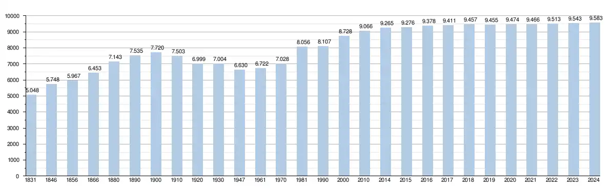 Elle comptait, au , 9 585 habitants (4 658 hommes et 4 927 femmes) [4], soit une densité de 223,06 habitants/km² pour une superficie de 42,97 km²[5].
