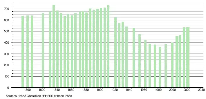 L'évolution du nombre d'habitants est connue à travers les recensements de la population effectués dans la commune depuis 1793. Pour les communes de moins de 10 000 habitants, une enquête de recensement portant sur toute la population est réalisée tous les cinq ans, les populations légales des années intermédiaires étant quant à elles estimées par interpolation ou extrapolation[18]. Pour la commune, le premier recensement exhaustif entrant dans le cadre du nouveau dispositif a été réalisé en 2005[19].