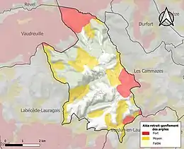 Le retrait-gonflement des sols argileux est susceptible d'engendrer des dommages importants aux bâtiments en cas d’alternance de périodes de sécheresse et de pluie. 41,4 % de la superficie communale est en aléa moyen ou fort (75,2 % au niveau départemental et 48,5 % au niveau national). Sur les 167 bâtiments dénombrés sur la commune en 2019, 88 sont en aléa moyen ou fort, soit 53 %, à comparer aux 94 % au niveau départemental et 54 % au niveau national. Une cartographie de l'exposition du territoire national au retrait gonflement des sols argileux est disponible sur le site du BRGM[23],[Carte 3].