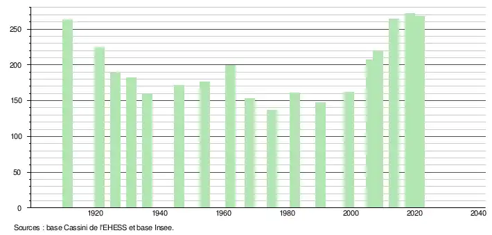 L'évolution du nombre d'habitants est connue à travers les recensements de la population effectués dans la commune depuis 1911. Pour les communes de moins de 10 000 habitants, une enquête de recensement portant sur toute la population est réalisée tous les cinq ans, les populations légales des années intermédiaires étant quant à elles estimées par interpolation ou extrapolation[28]. Pour la commune, le premier recensement exhaustif entrant dans le cadre du nouveau dispositif a été réalisé en 2008[29].