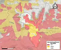 La commune est vulnérable au risque de mouvements de terrains constitué principalement du retrait-gonflement des sols argileux[22]. Cet aléa est susceptible d'engendrer des dommages importants aux bâtiments en cas d’alternance de périodes de sécheresse et de pluie. 80,6 % de la superficie communale est en aléa moyen ou fort (76,3 % au niveau départemental et 48,5 % au niveau national). Sur les 234 bâtiments dénombrés sur la commune en 2019, 214 sont en aléa moyen ou fort, soit 91 %, à comparer aux 90 % au niveau départemental et 54 % au niveau national. Une cartographie de l'exposition du territoire national au retrait gonflement des sols argileux est disponible sur le site du BRGM[23],[Carte 3].