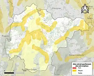 Le retrait-gonflement des sols argileux est susceptible d'engendrer des dommages importants aux bâtiments en cas d’alternance de périodes de sécheresse et de pluie[17]. 27,7 % de la superficie communale est en aléa moyen ou fort (27 % au niveau départemental et 48,5 % au niveau national métropolitain)[Carte 2]. Depuis le , en application de la loi ÉLAN, différentes contraintes s'imposent aux vendeurs, maîtres d'ouvrages ou constructeurs de biens situés dans une zone classée en aléa moyen ou fort[Note 3],[18].