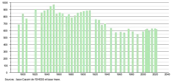 L'évolution du nombre d'habitants est connue à travers les recensements de la population effectués dans la commune depuis 1793. Pour les communes de moins de 10 000 habitants, une enquête de recensement portant sur toute la population est réalisée tous les cinq ans, les populations légales des années intermédiaires étant quant à elles estimées par interpolation ou extrapolation[29]. Pour la commune, le premier recensement exhaustif entrant dans le cadre du nouveau dispositif a été réalisé en 2004[30].
