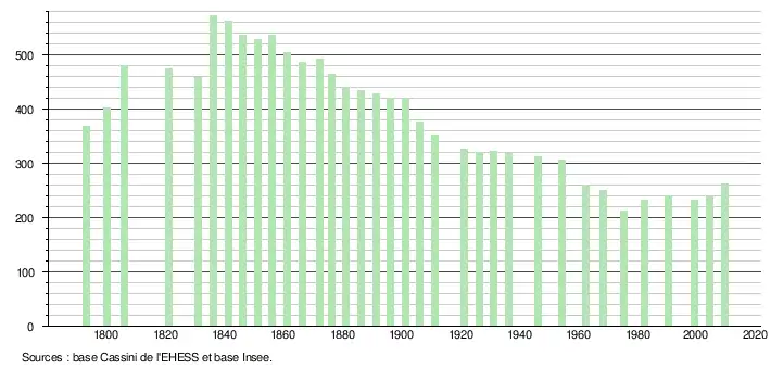 L'évolution du nombre d'habitants est connue à travers les recensements de la population effectués dans la commune depuis 1793. À partir du , les populations légales des communes sont publiées annuellement dans le cadre d'un recensement qui repose désormais sur une collecte d'information annuelle, concernant successivement tous les territoires communaux au cours d'une période de cinq ans. Pour les communes de moins de 10 000 habitants, une enquête de recensement portant sur toute la population est réalisée tous les cinq ans, les populations légales des années intermédiaires étant quant à elles estimées par interpolation ou extrapolation[17]. Pour la commune, le premier recensement exhaustif entrant dans le cadre du nouveau dispositif a été réalisé en 2004[18],[Note 3].