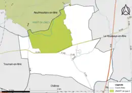 - Le Bréon, 22,13 km[8] et ses affluents drainent le secteur du village et des Vieilles Chapelles. Le Bréon sert de limite avec Marles-en-Brie au sud-est ;