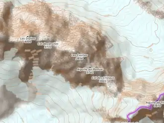 | Voie la plus facile | versant sud du col de la Tour des Courtes et arête ouest-nord-ouest, depuis le refuge du Couvercle (17 août 1897 par O. Schuster et A. Swaine) | ||