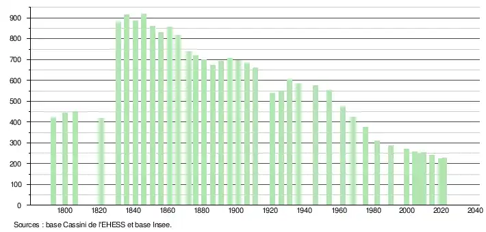 L'évolution du nombre d'habitants est connue à travers les recensements de la population effectués dans la commune depuis 1793. Pour les communes de moins de 10 000 habitants, une enquête de recensement portant sur toute la population est réalisée tous les cinq ans, les populations légales des années intermédiaires étant quant à elles estimées par interpolation ou extrapolation[20]. Pour la commune, le premier recensement exhaustif entrant dans le cadre du nouveau dispositif a été réalisé en 2004[21].