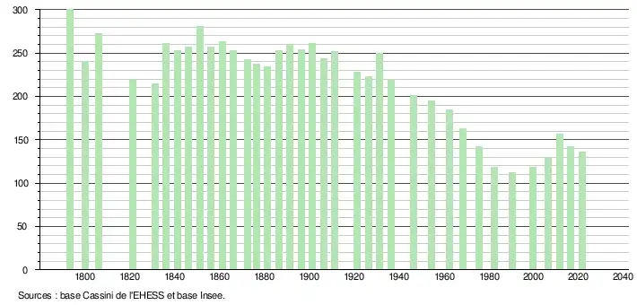 L'évolution du nombre d'habitants est connue à travers les recensements de la population effectués dans la commune depuis 1793. Pour les communes de moins de 10 000 habitants, une enquête de recensement portant sur toute la population est réalisée tous les cinq ans, les populations légales des années intermédiaires étant quant à elles estimées par interpolation ou extrapolation[19]. Pour la commune, le premier recensement exhaustif entrant dans le cadre du nouveau dispositif a été réalisé en 2006[20].
