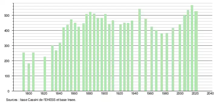 L'évolution du nombre d'habitants est connue à travers les recensements de la population effectués dans la commune depuis 1793. Pour les communes de moins de 10 000 habitants, une enquête de recensement portant sur toute la population est réalisée tous les cinq ans, les populations légales des années intermédiaires étant quant à elles estimées par interpolation ou extrapolation[16]. Pour la commune, le premier recensement exhaustif entrant dans le cadre du nouveau dispositif a été réalisé en 2005[17].