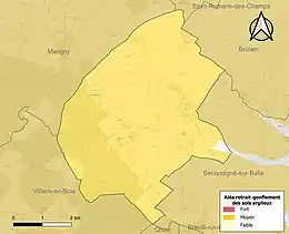 Les mouvements de terrains susceptibles de se produire sur la commune sont des tassements différentiels[16]. Le retrait-gonflement des sols argileux est susceptible d'engendrer des dommages importants aux bâtiments en cas d’alternance de périodes de sécheresse et de pluie[17]. 99,4 % de la superficie communale est en aléa moyen ou fort (54,9 % au niveau départemental et 48,5 % au niveau national)[Carte 2]. Depuis le , en application de la loi ELAN, différentes contraintes s'imposent aux vendeurs, maîtres d'ouvrages ou constructeurs de biens situés dans une zone classée en aléa moyen ou fort[Note 3],[18].