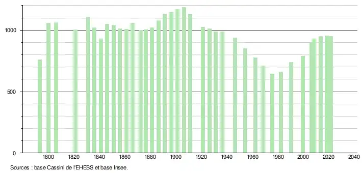 L'évolution du nombre d'habitants est connue à travers les recensements de la population effectués dans la commune depuis 1793. Pour les communes de moins de 10 000 habitants, une enquête de recensement portant sur toute la population est réalisée tous les cinq ans, les populations légales des années intermédiaires étant quant à elles estimées par interpolation ou extrapolation[27]. Pour la commune, le premier recensement exhaustif entrant dans le cadre du nouveau dispositif a été réalisé en 2008[28].