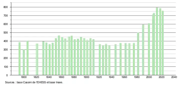 L'évolution du nombre d'habitants est connue à travers les recensements de la population effectués dans la commune depuis 1793. Pour les communes de moins de 10 000 habitants, une enquête de recensement portant sur toute la population est réalisée tous les cinq ans, les populations légales des années intermédiaires étant quant à elles estimées par interpolation ou extrapolation[14]. Pour la commune, le premier recensement exhaustif entrant dans le cadre du nouveau dispositif a été réalisé en 2007[15].