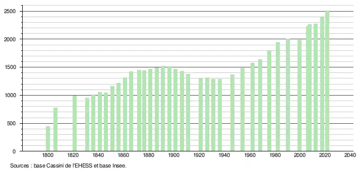 L'évolution du nombre d'habitants est connue à travers les recensements de la population effectués dans la commune depuis 1800. Pour les communes de moins de 10 000 habitants, une enquête de recensement portant sur toute la population est réalisée tous les cinq ans, les populations légales des années intermédiaires étant quant à elles estimées par interpolation ou extrapolation[21]. Pour la commune, le premier recensement exhaustif entrant dans le cadre du nouveau dispositif a été réalisé en 2007[22].