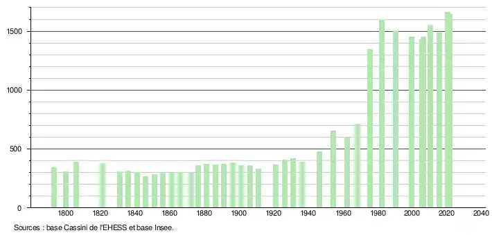 L'évolution du nombre d'habitants est connue à travers les recensements de la population effectués dans la commune depuis 1793. Pour les communes de moins de 10 000 habitants, une enquête de recensement portant sur toute la population est réalisée tous les cinq ans, les populations légales des années intermédiaires étant quant à elles estimées par interpolation ou extrapolation[26]. Pour la commune, le premier recensement exhaustif entrant dans le cadre du nouveau dispositif a été réalisé en 2005[27].