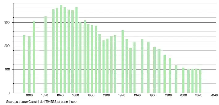 L'évolution du nombre d'habitants est connue à travers les recensements de la population effectués dans la commune depuis 1793. Pour les communes de moins de 10 000 habitants, une enquête de recensement portant sur toute la population est réalisée tous les cinq ans, les populations légales des années intermédiaires étant quant à elles estimées par interpolation ou extrapolation[18]. Pour la commune, le premier recensement exhaustif entrant dans le cadre du nouveau dispositif a été réalisé en 2006[19].