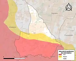 Le retrait-gonflement des sols argileux est susceptible d'engendrer des dommages importants aux bâtiments en cas d’alternance de périodes de sécheresse et de pluie. 68,5 % de la superficie communale est en aléa moyen ou fort (67,4 % au niveau départemental et 48,5 % au niveau national). Sur les 319 bâtiments dénombrés sur la commune en 2019, 295 sont en aléa moyen ou fort, soit 92 %, à comparer aux 81 % au niveau départemental et 54 % au niveau national. Une cartographie de l'exposition du territoire national au retrait gonflement des sols argileux est disponible sur le site du BRGM[19],[Carte 3].