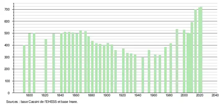 L'évolution du nombre d'habitants est connue à travers les recensements de la population effectués dans la commune depuis 1793. Pour les communes de moins de 10 000 habitants, une enquête de recensement portant sur toute la population est réalisée tous les cinq ans, les populations légales des années intermédiaires étant quant à elles estimées par interpolation ou extrapolation[26]. Pour la commune, le premier recensement exhaustif entrant dans le cadre du nouveau dispositif a été réalisé en 2004[27].