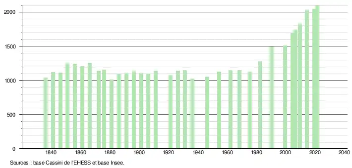 L'évolution du nombre d'habitants est connue à travers les recensements de la population effectués dans la commune depuis 1836. Pour les communes de moins de 10 000 habitants, une enquête de recensement portant sur toute la population est réalisée tous les cinq ans, les populations légales des années intermédiaires étant quant à elles estimées par interpolation ou extrapolation[32]. Pour la commune, le premier recensement exhaustif entrant dans le cadre du nouveau dispositif a été réalisé en 2004[33].