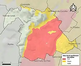 Le retrait-gonflement des sols argileux est susceptible d'engendrer des dommages importants aux bâtiments en cas d’alternance de périodes de sécheresse et de pluie. 67,4 % de la superficie communale est en aléa moyen ou fort (59,3 % au niveau départemental et 48,5 % au niveau national). Sur les 739 bâtiments dénombrés sur la commune en 2019, 737 sont en aléa moyen ou fort, soit 100 %, à comparer aux 85 % au niveau départemental et 54 % au niveau national. Une cartographie de l'exposition du territoire national au retrait gonflement des sols argileux est disponible sur le site du BRGM[24],[Carte 2].
