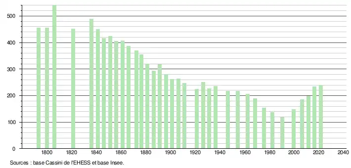 L'évolution du nombre d'habitants est connue à travers les recensements de la population effectués dans la commune depuis 1793. Pour les communes de moins de 10 000 habitants, une enquête de recensement portant sur toute la population est réalisée tous les cinq ans, les populations légales des années intermédiaires étant quant à elles estimées par interpolation ou extrapolation[23]. Pour la commune, le premier recensement exhaustif entrant dans le cadre du nouveau dispositif a été réalisé en 2006[24].